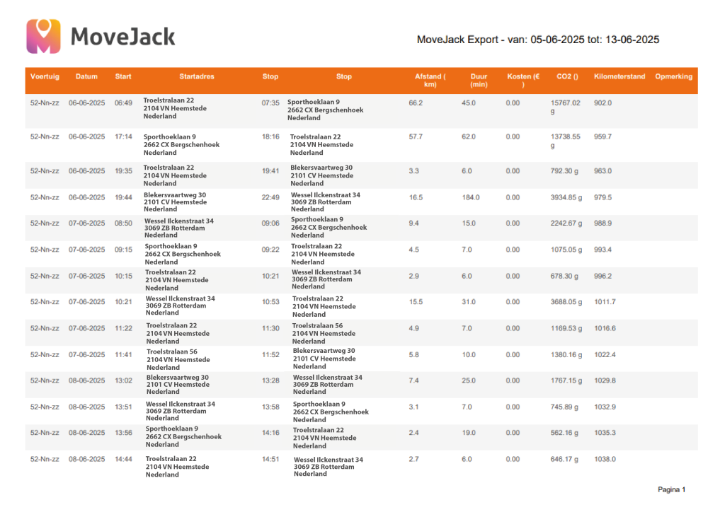 Je rapport bevat precies wat je nodig hebt: van starttijd en -adres tot eindtijd, afstand, duur, kosten, CO₂-uitstoot, kilometerstand en eventuele opmerkingen. Zo houd je niet alleen alles netjes bij, maar beschik je ook over een compleet en belastingproof document.