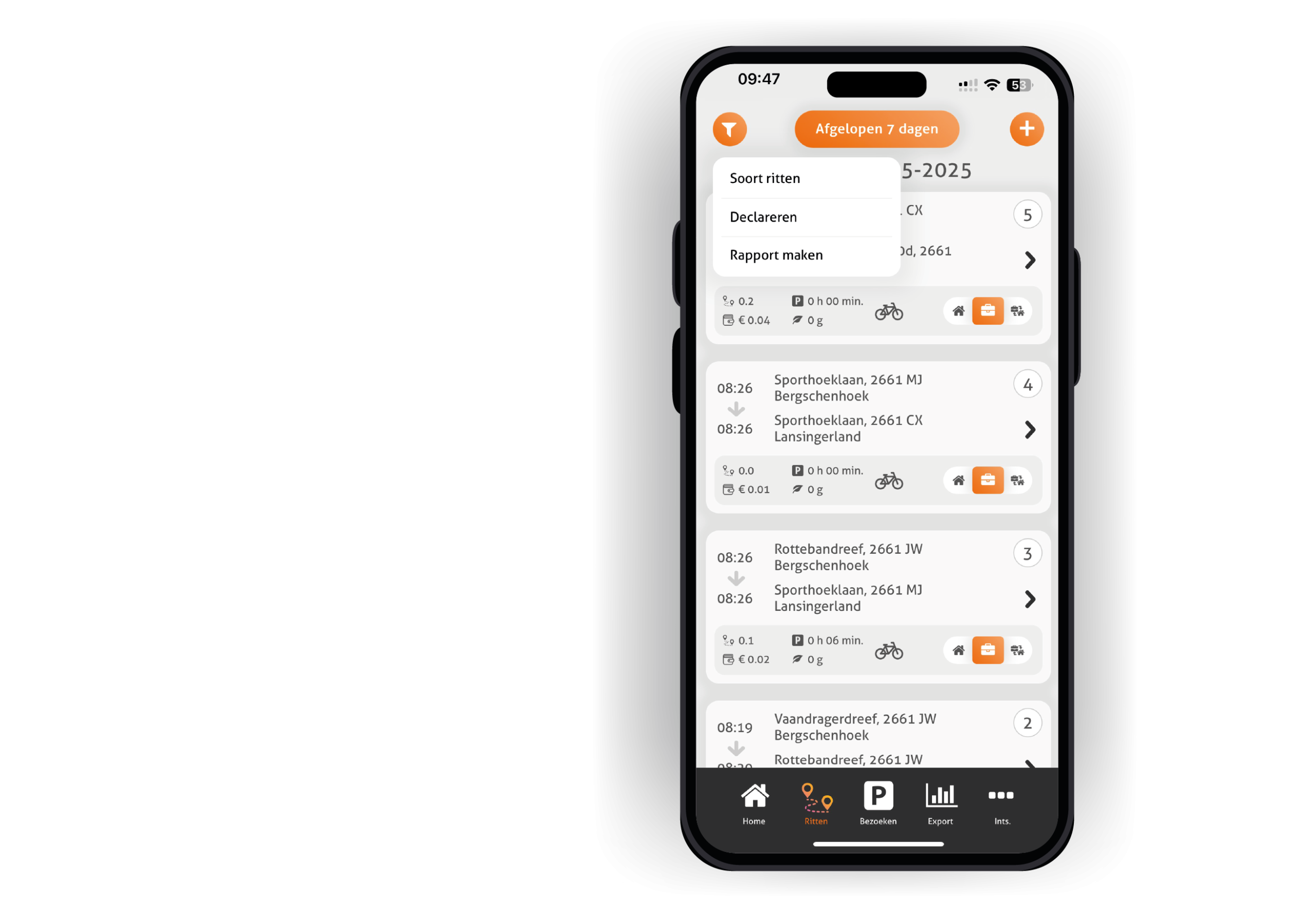 Maak moeiteloos rapporten aan per dag, week of project. Selecteer de bezoeken die je wilt declareren en zie direct de bijbehorende kosten. Klaar voor je factuur of urenverantwoording, zonder rekenwerk.